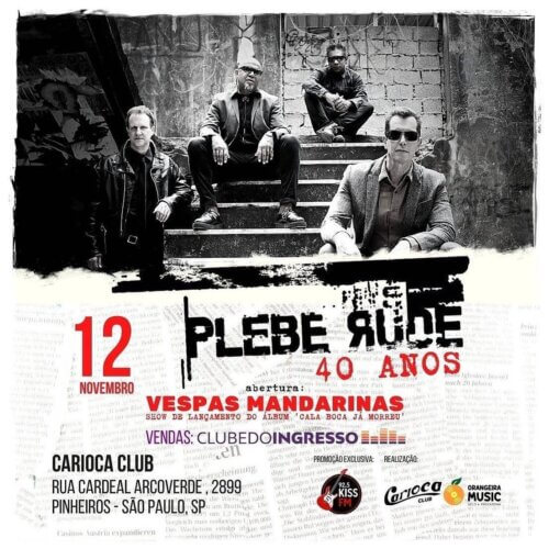 O palco do Carioca Club, em São Paulo, recebe nesta sexta-feira (12), a partir das 19h, as bandas de rock nacional Plebe Rude, com show completo alusivo aos 40 anos de carreira, e Vespas Mandarinas, que abre a noite.