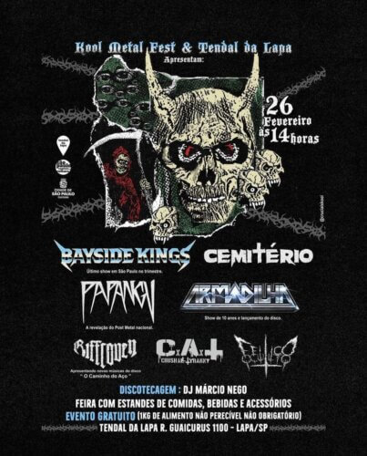 Line-up feroz para um ano especial de Kool Metal: Pagangu, Bayside Kings, Cemitério, Armadilha, Riffcoven, Feitiço Oculto e Crush All Tyranny. O Bayside Kings, pilar sólido do hardcore santista, faz o primeiro show do ano neste Pre-Kool – primeiro e único antes do lançamento do novo EP Dualidade, o terceiro da trilogia #livreparatodos. “Queríamos muito tocar em um Kool Metal e esse será um show histórico, como na última vez no Tendal, e deve vir um repertório inédito. Será um show de energia”, eles destacam. Pagangu é uma banda brasileira de rock progressivo e metal experimental. Formada em 2012 em João Pessoa, Paraíba, o grupo chegou à vanguarda do metal experimental sul-americano com o lançamento do LP Holoceno em 2021, que apareceu na lista de Melhores de Anos de diversas mídias nacionais e internacionais. “Nossa apresentação na prévia do Kool Metal Fest, que ocorre no Tendal da Lapa, marca nosso primeiro encontro com a plateia da capital paulista e estamos super ansiosos para entregar o peso e as idiossincrasias do Holoceno. O disco será a coluna vertebral do show e da turnê, mas o show também contará com material novo”, destaca a banda. Cemitério começou como um projeto solo de estúdio de Hugo Golon (Side Effectz, Whipstriker, Flagelador, Comando Nuclear, Toxic Holocaust entre outros) e já é uma banda cultuada do underground nacional, sempre lembrada quando o assunto é death metal. Neste pré, será mais uma apresentação frenética e pesada. O heavy metal tradicional será representado no evento pelo Armadilha, que sim, está de volta para celebrar 10 anos! E a banda paulista avisa: será um dos poucos shows em 2023, ou seja, virá com energia total. “É hora da revolução, deixamos de nos calar ! Aquele que tem sangue de ferro enfrenta a mais dura batalha!”, anuncia a banda. Os magos dos riffs Riffcoven representam o stoner/doom no evento! A banda paulista promete um setlist apenas com as músicas em português, muitas delas do ainda inédito disco ‘O Caminho do Aço’, que sai um dia depois do festival. Serviço |