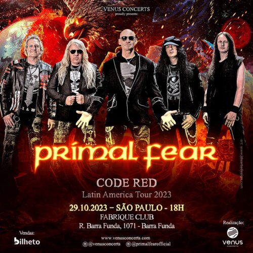Com a inconfundível potente e histórica voz de Ralf Scheepers, a icônica banda de heavy metal alemã Primal Fear volta a São Paulo neste domingo (29/10), com show agendado no Fabrique Club. A realização é da Vênus Concerts. O show na capital paulista faz parte da extensa turnê da banda alemã pela América Latina em divulgação do recém-lançado 14º álbum de estúdio, Code Red. Code Red é o sucessor do aclamado Metal Commando (2020), um disco que voltou a colocar o Primal Fear em destaque no heavy metal mundial, além de reforçar a criatividade da banda em seus 25 anos de carreira. Além de Scheepers, dono de uma trajetória brilhante desde os anos à frente de outra lenda do metal alemão, o Gamma Ray, o Primal Fear tem o experiente Mat Sinner no baixo, outro integrante original. Nesta turnê, no entanto, quem assume o instrumento é Alex Jansen (Between Worlds). A banda, hoje, ainda é Michael Ehré (bateria, também do Gamma Ray) e conta com um trio de guitarras: Tom Naumann, Alex Beyrodt e Magnus Karlsson, todos músicos renomados e com passagens brilhantes em outras formações de heavy metal. No Brasil, o Primal Fear já passou por Santo André (21), Brasília (22) e Curitiba (26). Outra parada do Primal Fear em terras brasileiras é dia 28/10 em Limeira, no interior de São Paulo, onde toca no Mirage Eventos, uma das principais casas de show na região para bandas internacionais de heavy metal. Ingresso aqui: https://www.circleofinfinityproducoes.com. A turnê 2023 do Primal Fear continua na Argentina, em Buenos Aires (31/10, Arena Sur, ingressos aqui), no Chile, em Santiago (1/11, Blondie), na Costa Rica, em San José (4/11, Pepper’s Club), na Colômbia, em Bogotá (5/11, Ace of Spades Club), no Peru, em Lima (7/11, C.C Festiva) e no México, em Monterrey (10/11, no Mexico Metal Fest, ingresso aqui). SERVIÇO |