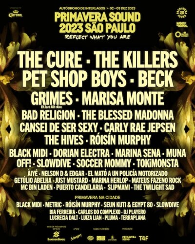“Reflect what you are” foi o conceito estabelecido globalmente pelo Primavera Sound para este ano. Isso quer dizer que, após 20 edições de existência, o festival se tornou o espelho da comunidade que vai — de perto e de longe — para curtir os dias de evento, o que faz com que o público se reconheça no line-up. No Brasil, o Primavera Sound São Paulo – realizado pela TIME FOR FUN e apresentado por Corona – tem a sua segunda edição confirmada para os dias 2 e 3 dezembro, no Autódromo de Interlagos, em São Paulo, e, agora, apresenta a sua programação completa (e que reflete os seguidores do festival catalão mundo afora). A banda inglesa The Cure, do gigante Robert Smith, e o The Killers serão os headliners na capital paulista, que conta também com o duo inglês Pet Shop Boys, os símbolos do indie Beck e Grimes, os veteranos do Bad Religion e ainda: The Blessed Madonna, Carly Rae Jepsen e The Hives. Entre os representantes brasileiros, se apresentam Marisa Monte, Cansei de Ser Sexy, Marina Sena, MC Bin Laden, entre outros. O Primavera na Cidade, programação musical que se espalha pela metrópole durante os dias da semana do evento, por sua vez, confirma os shows exclusivos de Seun Kuti & Egypt 80 e da banda canadense Metric, além de trazer Slowdive, Black Midi e Róisín Murphy – também atrações do festival – para apresentações mais intimistas (confira a programação completa e a dinâmica do Primavera na Cidade no fim do texto). Os ingressos, disponíveis nas modalidades Primavera Passaporte e Primavera VIP Passaporte, estão à venda online (ticketsforfun.com.br – com taxa) ou na bilheteria oficial (Av. Brigadeiro Luís Antônio, 411, República – sem taxa). Vale lembrar que os ingressos para apenas um dia de evento, bem como a divisão do line-up por dia, serão divulgados em breve.
