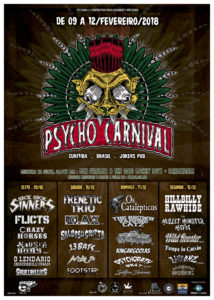 Com bandas de sete países, entre atrações inéditas, nomes de peso e revelações do psychobilly e subgêneros, a edição 2018 do Psycho Carnival, em Curitiba (Paraná), é onde o rock dita as regras durante o período do carnaval. De 8 a 12 de fevereiro, o festival – que é o maior do estilo na América do Sul e um dos mais estabelecidos dentro do Brasil – levará 26 bandas ao Jokers Pub, divididas num pré-esquenta na quinta-feira, 8, na Festa de Esquenta da sexta, 9, e nas três noites seguintes, de sábado a segunda-feira. A realização é da Psychobilly Corporation.