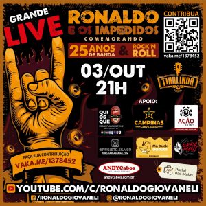 Neste sábado (03/10), às 21h, rola uma Live de comemoração dos 25 anos de Rock da banda Ronaldo e os Impedidos, que é liderada pelo ex-goleiro do Corinthians e comentarista da Band, Ronaldo Giovaneli.