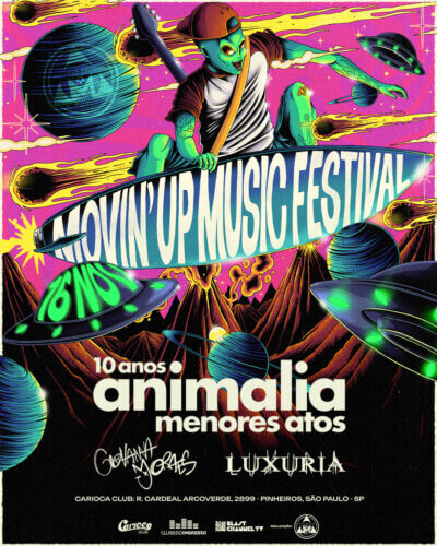O Carioca Club, em São Paulo, recebe no próximo dia 16 de novembro (um sábado) o Movin’ Up Music Festival, que reunirá três importantes artistas de diferentes gerações das últimas décadas: terá menores atos com o último show que celebra os 10 anos do disco de estreia Animália, o show de retorno da Luxúria com a nova vocalista Giul Abreu e a mais nova sensação do rock, Giovanna Moraes com sua música direta e provocativa.
