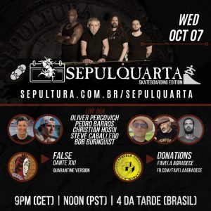 Desde o início da pandemia de Covid-19, o Sepultura vêm apresentando o seu projeto semanal pelo canal do youtube da banda. A partir da próxima quarta-feira, dia 7 de outubro, às 16h (horário de Brasília), os integrantes apresentarão o SepulQuarta com um novo formato. A exibição será a cada duas semanas com uma proposta temática e convidados que não necessariamente integrarão na performance musical junto com a banda, como tem acontecido nas últimas edições. Para abrir esse novo formato, Andreas Kisser e Derrick Green receberão para a Live Q&A os skatistas Oliver Percovich, Steve Caballer, Pedro Barros, Christian Hosoi e Bob Burnquist. “Estamos extremamente ansiosos para receber essas lendas do skate! Além disso, Oliver Percovich, vai contar sobre sua ONG chamada Skateistan, que usa o skate para conectar as crianças à educação no Afeganistão. Já Bob Burnquist, contará sobre o Instituto que leva seu nome e tem como foco o esporte, saúde e inclusão social. Estamos ansiosos para ouvir suas histórias e jornadas através do amor pelo skate e da conexão com a música.” – afirma Green.