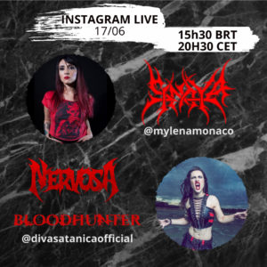 A vocalista e guitarrista da Sinaya, Mylena Mônaco, fará nesta quarta (17/06) uma Live com a vocalista espanhola, Diva Satânica, que assumiu recentemente os vocais da Nervosa – ela já cantava na banda Bloodhunter.