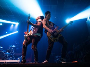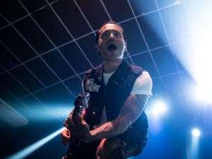 Voltando para o encore, Gabe exibiu a bandeira anteriormente lançada e If I’m James Dean, You’re Audrey Hepburn (única de With Ears To See And Eyes To Hear no show) foi o arregaço que incendiou de vez o Tropical Butantã e Justin chegou a abrir um espacate quase completo no palco (não se sabe como!). If You Can’t Hang (única de Let’s Cheers To This) seria a penúltima, manteve a energia elevada, com o público cantando em alto e bom som, e trouxe o momento mais tocante da noite, por parte dos fãs, que deram um show dentro do show antes da estrofe iniciada por “I met a girl at twenty-three”, atendendo a um pedido de Kellin: “Se vocês têm um celular, levantem seus aparelhos para iluminar o salão, do fundo até a frente e de lado a lado. São Paulo, muito obrigado por virem para cá hoje à noite”, e o que se viu foi um mar de lanternas clareando toda a casa, em um lindo gesto. Por fim, Kick Me foi um verdadeiro pé na porta, com o perdão do trocadilho, e seu final contou com o vocalista indo mais uma vez para o pit dos fotógrafos, levando à loucura, mais uma vez, os fãs que estavam no gargarejo. Ao retonar ao palco, iniciaram-se os acenos de despedida e a chuva de palhetas, baquetas, toalhas e munhequeiras para os fãs, ao som de Back In Black, do AC/DC. A lamentar, somente a apresentação não ter durado sequer oitenta minutos e o fato de terem retirado Iris, cover do Goo Goo Dolls, do set (além de Gossip).