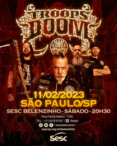 O The Troops of Doom segue a turnê de promoção do álbum de estreia, “Antichrist Reborn” (2022), e se prepara para mais uma data em São Paulo, com um show agendado para o dia 11 de fevereiro (sábado) no SESC Belenzinho. Na ocasião, Alex Kafer (vocal e baixo), Jairo “Tormentor” Guedz (guitarra), Marcelo Vasco (guitarra) e Alexandre Oliveira (bateria) farão o primeiro show completo, com 1h30 de duração. “O set list inédito terá músicas que nunca tocamos antes ao vivo. São Paulo sempre nos recebe bem, desde nossa estreia ao vivo em 2021, mas agora a apresentação será no lugar onde grandes nomes do metal nacional, como Dorsal Atlântica, Krisiun, The Mist entre outros, fizeram grandes shows e trouxeram muita alegria pros seus fãs”, comentou Jairo “Tormentor” Guedz.