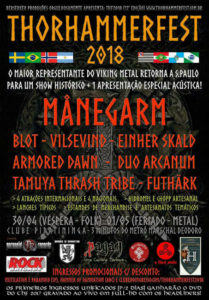 Dia 01/05 (feriado – Metal Day) a partir das 13 hrs: FUTHÄRK, TAMUYA THRASH TRIBE, EINHER SKALD, ARMORED DAWN, BLOT e MANEGARM.