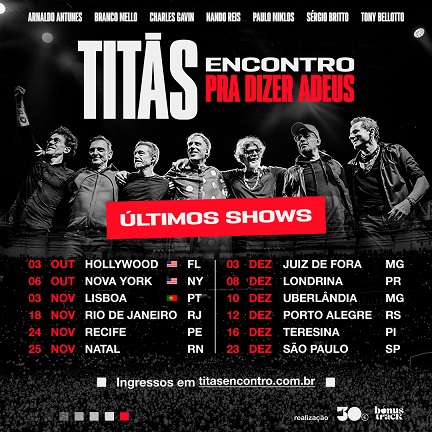 “Desde a estreia do Titãs Encontro, sempre soubemos que este era um projeto com início, meio e fim. E não por falta de demanda, que, desde o anúncio da turnê, foi insana. Mas pela multiplicidade artística que existe em cada um dos integrantes”, comenta Guss Luveira, Vice Presidente de Marketing da 30e . “Essas novas datas serão realmente as últimas. Sem blefe, sem jogada de marketing. É, de fato, a última oportunidade ‘pra dizer adeus'”, ele complementa.