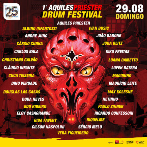 Dia 29 de agosto, o Tom Brasil recebe a primeira edição do Aquiles Priester Drum Festival, um super festival que contará com a participação de alguns dos maiores bateristas do Brasil, em apresentações distintas e impressionantes.