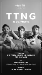Representante do alto escalão do math rock mundial, a banda britânica TTNG desembarca pela primeira vez no Brasil dia 16 de janeiro para show único em São Paulo, no Fabrique Club. O show, com realização da Onstage Agência e MGB Entertainment, terá o prestigiado quarteto paulista de post-rock E A Terra Nunca Me Pareceu Tão Distante na abertura.