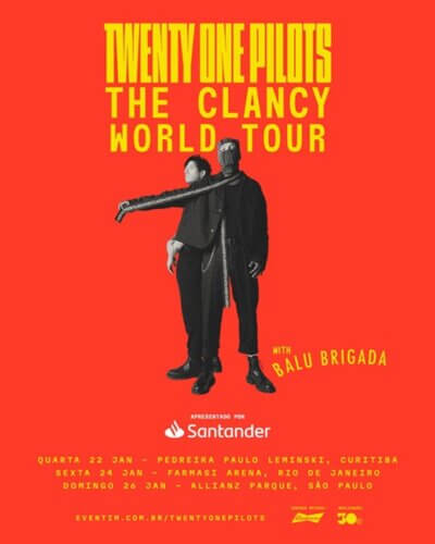 Há poucos dias do início da maior turnê do Twenty One Pilots pela América Latina, o duo americano anuncia a neozelandesa Balu Brigada como banda de abertura de suas apresentações. The Clancy World Tour tem início no próximo dia 16 de janeiro, em Bogotá, na Colômbia. No Brasil, as apresentações com realização da 30e, maior produtora brasileira de entretenimento ao vivo, com patrocínio do Santander Brasil e Budweiser como cerveja oficial, acontecem nos dias 22 de janeiro, na Pedreira Paulo Leminski, em Curitiba; 24 de janeiro, na Farmasi Arena, no Rio de Janeiro; e 26 de janeiro, no Allianz Parque, em São Paulo. Os ingressos estão disponíveis no site da Eventim e clientes com cartões Santander contam com um desconto exclusivo no valor dos ingressos (sujeito à disponibilidade e condições).