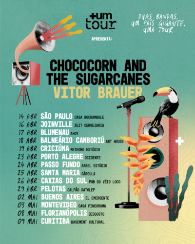 Considerados uma das grandes revelações na música, os paulistanos do Chococorn and the Sugarcanes caem na estrada com a turnê do seu aguardado segundo disco, Todos os Cães Merecem o Céu, que chega às plataformas digitais no dia 9 de março. Já o mineiro Vitor Brauer, um dos ícones do underground brasileiro, leva para os palcos o seu novo disco, Tréinquinumpára 08: Salvador, que será lançado em 22 de março.