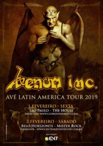 Os lendários Tony “Demolition Man” Dolan (vocal/baixo) e Mantas (guitarra), juntamente com o baterista Kling, se preparam para as novas apresentações em solo brasileiro sob a alcunha de Venom Inc.Invocando o nome da poderosa instituição inglesa do metal, o trio irá se apresentar nas cidades de São Paulo e Belo Horizonte em fevereiro de 2019 tocando faixas de seu bem sucedido álbum de estréia “Avé” (2017) e clássicos da banda Venom, uma equação que tem tudo para satisfazer os mais ardorosos e fiéis fãs.