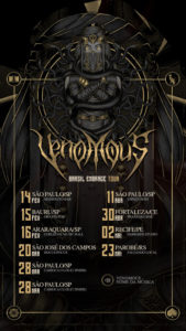 Após realizar a segunda turnê pela Europa para promover o novo álbum, “The Black Embrace”, o Venomous, formado por Tigas Pereira (vocal), Gui Calegari e Ivan Landgraf (guitarras), Renato Castro (baixo) e Lucas Prado (bateria), se prepara para a “Brasil Embrace Tour”, que terá início no dia 14 de fevereiro. “Estamos empolgados de poder levar nosso trabalho para alguns lugares que ainda não tínhamos chegado antes, como Nordeste e Sul do país, além de algumas cidades novas do interior de São Paulo. O melhor é que esta é apenas a primeira parte, pois mais datas serão confirmadas”, comemorou o baterista Lucas Prado.