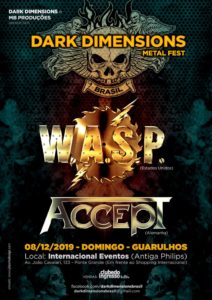 As bandas WASP e Accept confirmaram show único no Brasil para o dia 8 de dezembro. As apresentações serão no Dark Dimensions Metal Fest, com produção de Dark Dimension e MB Produções, na casa de shows Internacional Events (Antiga Philips – av. João Cavalari, 133) em Guarulhos (SP).